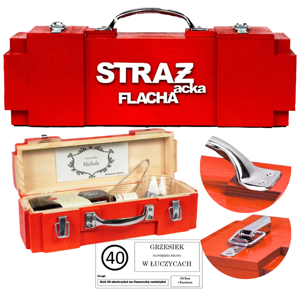🚒🎁 Skrzynka na alkohol to unikalny prezent dla strażaka, łączący praktyczność z docenieniem heroicznej służby. Dzięki niepowtarzalnemu designowi nawiązującemu do straży pożarnej i solidnemu wykonaniu, nasza skrzynka jest doskonałym sposobem na wyrażenie uznania i wdzięczności dla strażaków zarówno zawodowych, jak i z OSP.